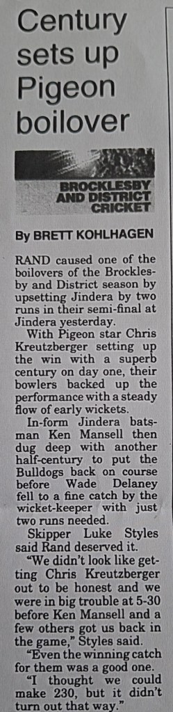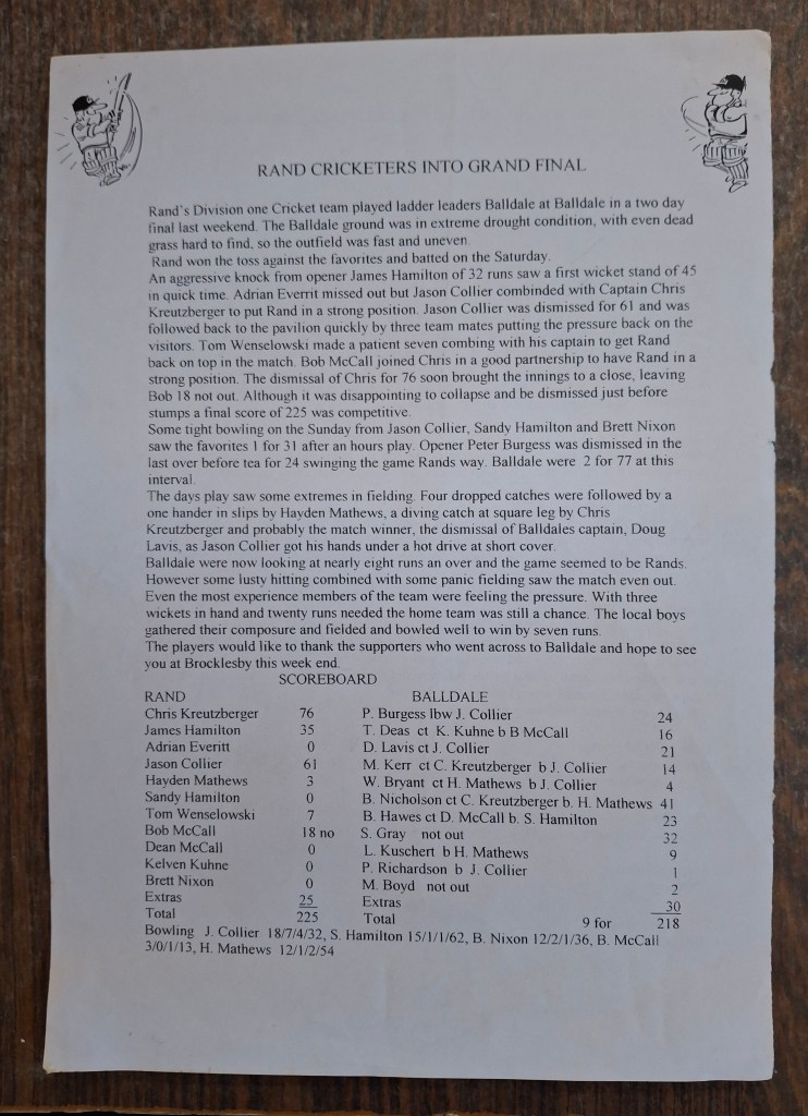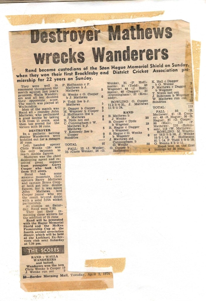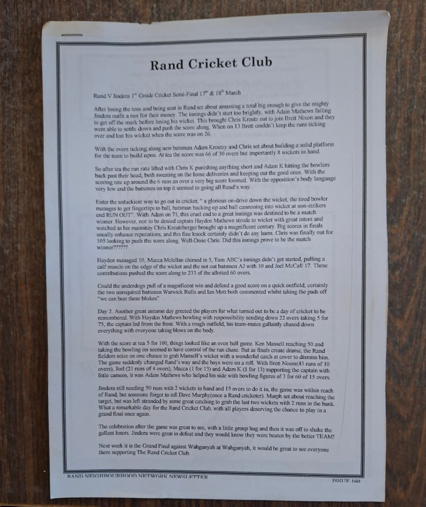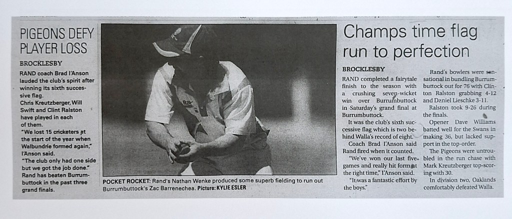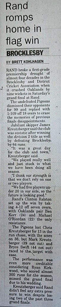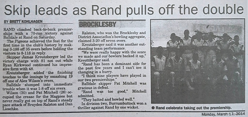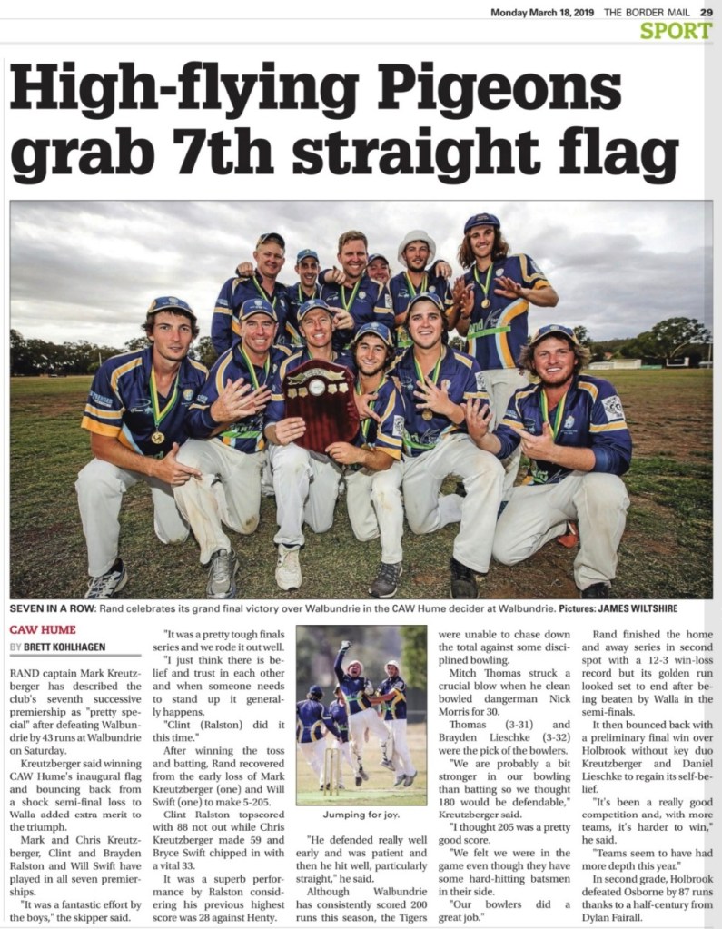 Article 1. A Grade Premiers 2012-13 (Credit: ‘The Border Mail‘)Article 2. A Grade Premiers 2013-14 (Credit: ‘The Border Mail‘)Article 3. A Grade Premiers 2014-15(Credit: ‘The Border Mail‘)Article 4. A Grade Premiers 2015-16(Credit: ‘The Border Mail‘)Article 5. A Grade Premiers 2016-17(Credit: ‘The Border Mail‘)Article 6. A Grade Premiers 2017-18(Credit: ‘The Border Mail‘)Article 7. A Grade Premiers 2018-19 (Credit: ‘The Border Mail‘)Article 8. A Grade Premiers 2019-20 (Credit: ‘The Border Mail‘)Article 9. A Grade Premiers 2019-20 (Credit: ‘Eastern Riverina Chronicle‘)Article 10. A Grade Semi Final 2002-03 (Credit: Rand Neighbourhood Network Newsletter)Article 11. First Grade Premiers 1973-74(Credit: Supplied by Terry Banfield)Article 12. A Grade Semi Final 2006-07(Credit: ‘The Rand Neighbourhood Network Newsletter’)Article 13. A Grade Semi Final 2011-12(Credit: ‘The Border Mail‘)Article 14. A Grade Semi Final 2003-04(Credit: ‘The Border Mail‘)Article 15. A Grade Semi Final 2006-07 (Credit: ‘The Border Mail‘)